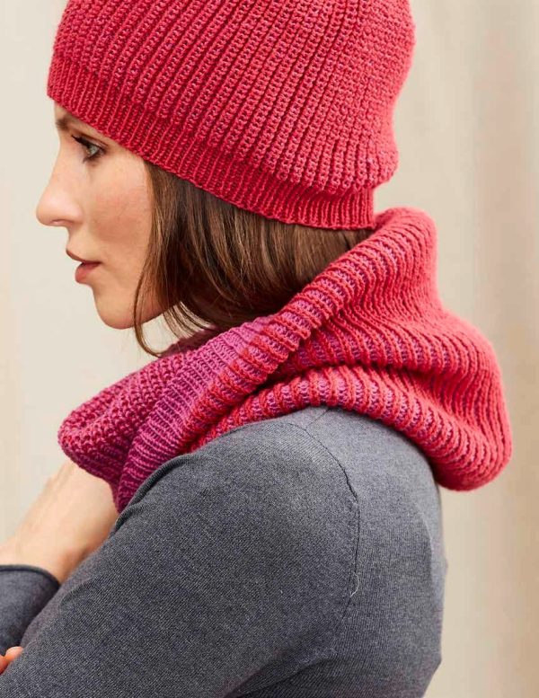 MATERIALS: Gedifra “Cottolana4-Ply” (50% Wool, 50% Cotton, 170 m/50 g): 100 g each in Red #2417 (col. 1) and in Magenta #2416 (col. 2). 1 circular needle size US 3 (3 mm).