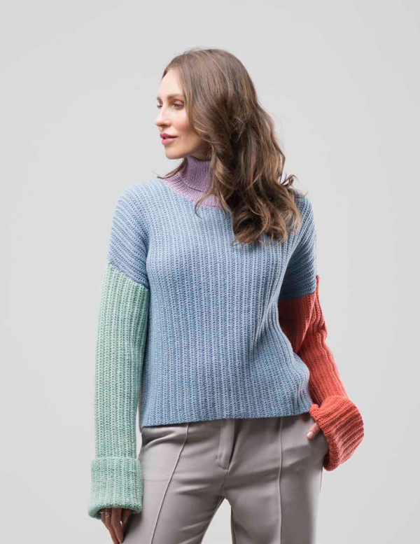 Gedifra Cottolana DK (50% virgin wool, 50% cotton; 120 m [132 yd]/50 g): 200/250/300 g each in light grey col 02507 and light blue col 02409, 150/200/250 g each in coral col 02418 and mint col 02405 and 50 g in purple col 02414.