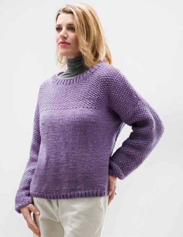 MATERIALS: Gedifra Naturae (100% virgin wool; 90 m [99 yd]/50 g): 500/600/650 g in purple col 02705. Size 6mm (US 10) needles Size 6mm (US 10) circular needle, 16in long